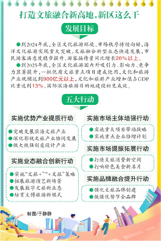 在發(fā)展目標(biāo)方面,《方案》明確提出,到2024年底,全區(qū)文化旅游環(huán)境、市場(chǎng)秩序持續(xù)向好,海洋文化旅游實(shí)現(xiàn)重大突破,文旅融合新型業(yè)態(tài)快速發(fā)展,市民游客滿意度穩(wěn)步提升,游客接待量同比增長(zhǎng)20%以上。到2025年底,全區(qū)文化旅游國(guó)內(nèi)外吸引力、影響力、競(jìng)爭(zhēng)力顯著提升,一批優(yōu)質(zhì)文旅重點(diǎn)項(xiàng)目建成使用,文化和旅游產(chǎn)業(yè)規(guī)模達(dá)到900億元以上,文化和旅游產(chǎn)業(yè)增加值占GDP比重達(dá)到13%,國(guó)際濱海旅游目的地建設(shè)初見成效。